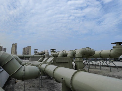 實驗設計室尾氣 → 活性酶類炭過濾系統器 → 引生產的風機 → 排出